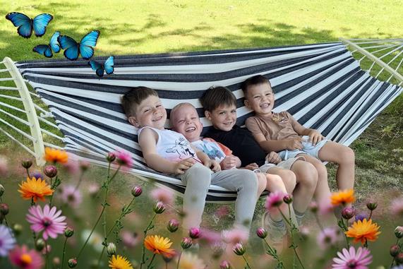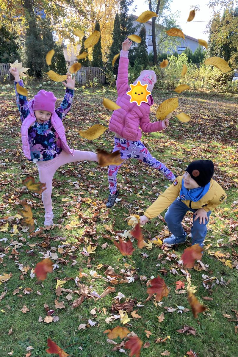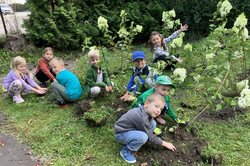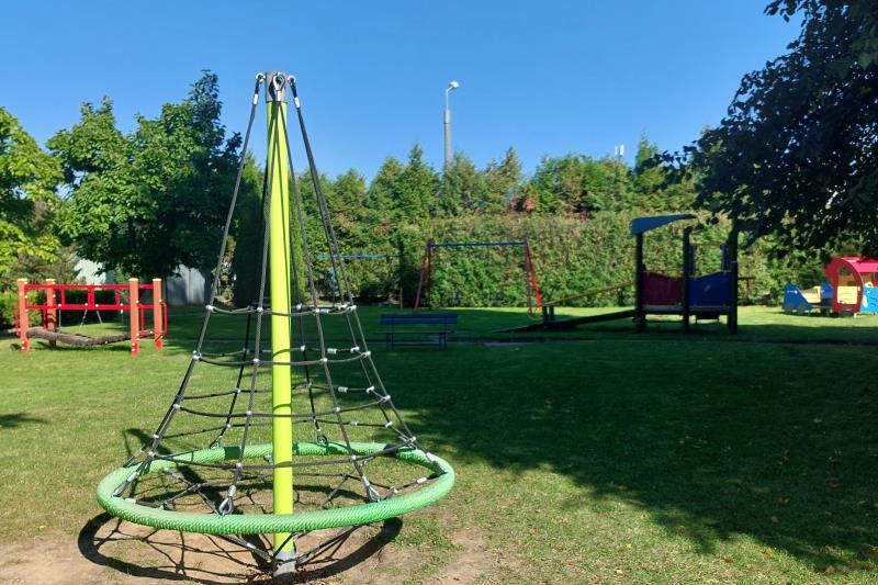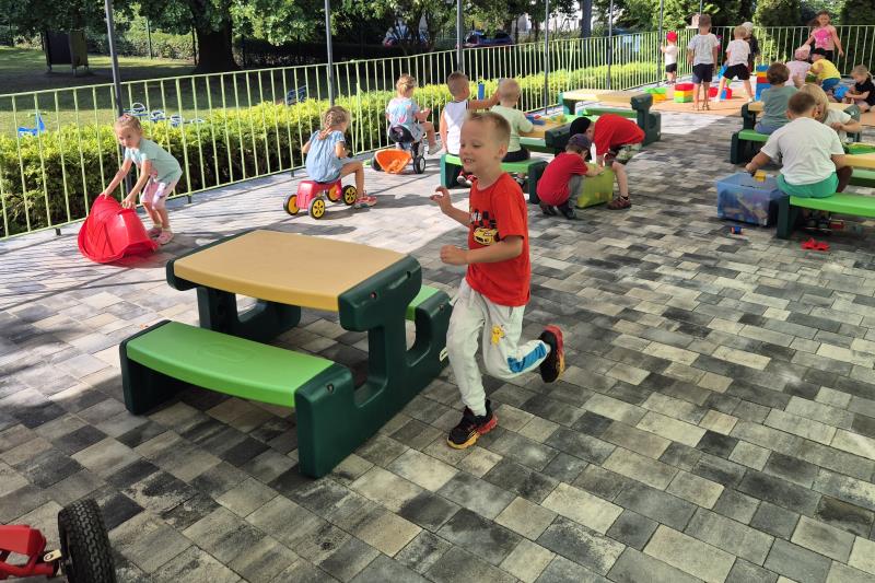 Posiadamy bardzo duży, zadbany ogród a w nim plac zabaw z urządzeniami do zabaw ruchowych, z trawnikiem – miejscem, gdzie chłopcy lubią rozgrywać mecze piłkarskie, z pięknymi, starymi drzewami, które dają nam cień w upalne dni. Mamy też olbrzymi zadaszony taras.