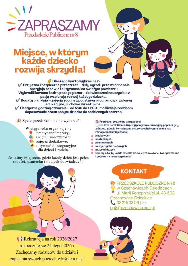 Oferta:Zapraszamy do Przedszkola Publicznego nr 8 w Czechowicach-Dziedzicach– miejsca bezpiecznego, pełnego ciepła, radości i inspirujących wyzwań edukacyjnych!